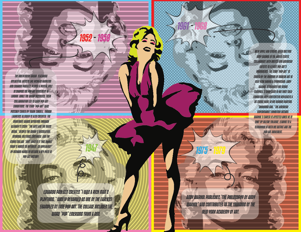Timeline highlighting few key moments and artists from the Pop Art movement, showing its evolution and cultural impact.